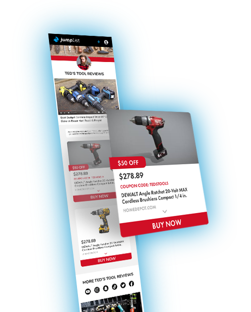 With JumpList, create visually appealing lists of links with ease. By adding coupons and discounts, you can further entice your viewers and maximize revenue potential. Simply paste product links and let JumpList do the rest. Ditch those boring blue links and upgrade to JumpList today!